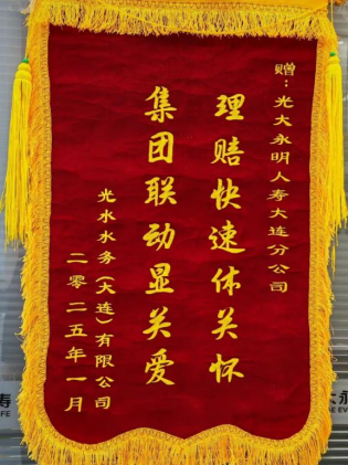 ? 近日,光大永明保險(xiǎn)大連分公司憑借卓越的理賠服務(wù),贏得了光水水務(wù)(大連)有限公司的高度認(rèn)可,獲贈(zèng)錦旗一面,錦旗上“理賠迅速顯關(guān)懷,集團(tuán)聯(lián)動(dòng)傳遞愛”的字樣,彰顯著客戶對(duì)其服務(wù)的誠摯感激與高度贊譽(yù)。