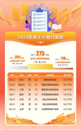 《光大永明保險(xiǎn)2023理賠服務(wù)年報(bào)》中顯示,當(dāng)年客戶理賠中,身故賠付件數(shù)占比6.1%,賠付金額占比23.4%。其中疾病身故件數(shù)占比86%,意外身故件數(shù)占比14%。公司“2023年度十大賠付案例”中,前9均為身故賠付,合計(jì)賠付金額高達(dá)1529萬。