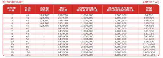 1、以上演示的“身故保險(xiǎn)金及額外身故保險(xiǎn)金”、“高度殘疾保險(xiǎn)金及額外高度殘疾保險(xiǎn)金”和“現(xiàn)金價(jià)值”均為保險(xiǎn)單年度末的數(shù)值。